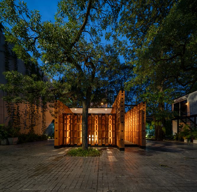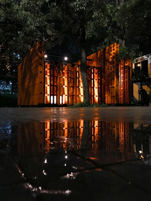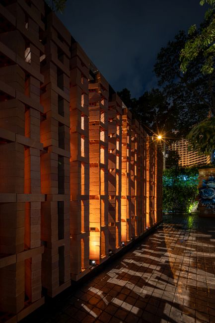 L’installazione è completata dal progetto illuminotecnico curato da Nulty+ e per il quale sono stati impiegati i proiettori Ginko 1.0 e Ginko 2.0 di L&L Luce&Light, che hanno permesso di creare un effetto di luce radente sulle superfici verticali per evidenziare la consistenza dei mattoni. Inoltre la luce che attraversa le pareti traforate, proietta sul pavimento esterno un gioco di luci e ombre che simboleggia le lanterne tradizionali tailandesi.