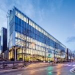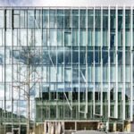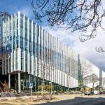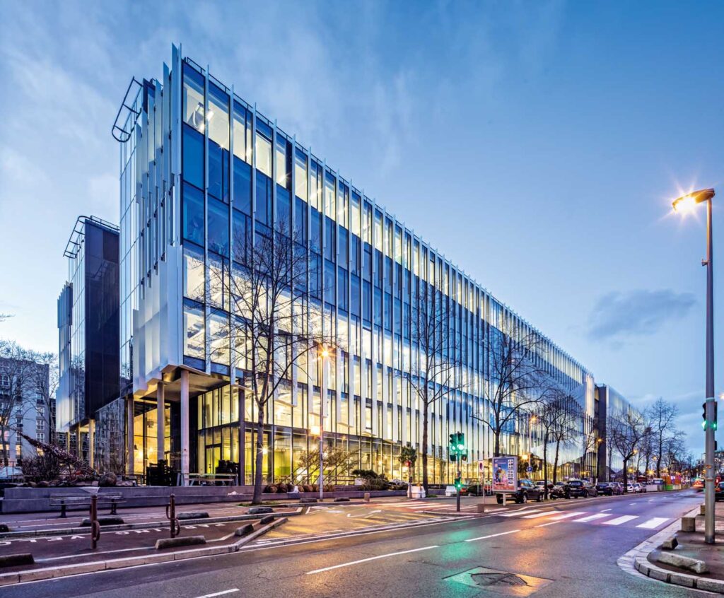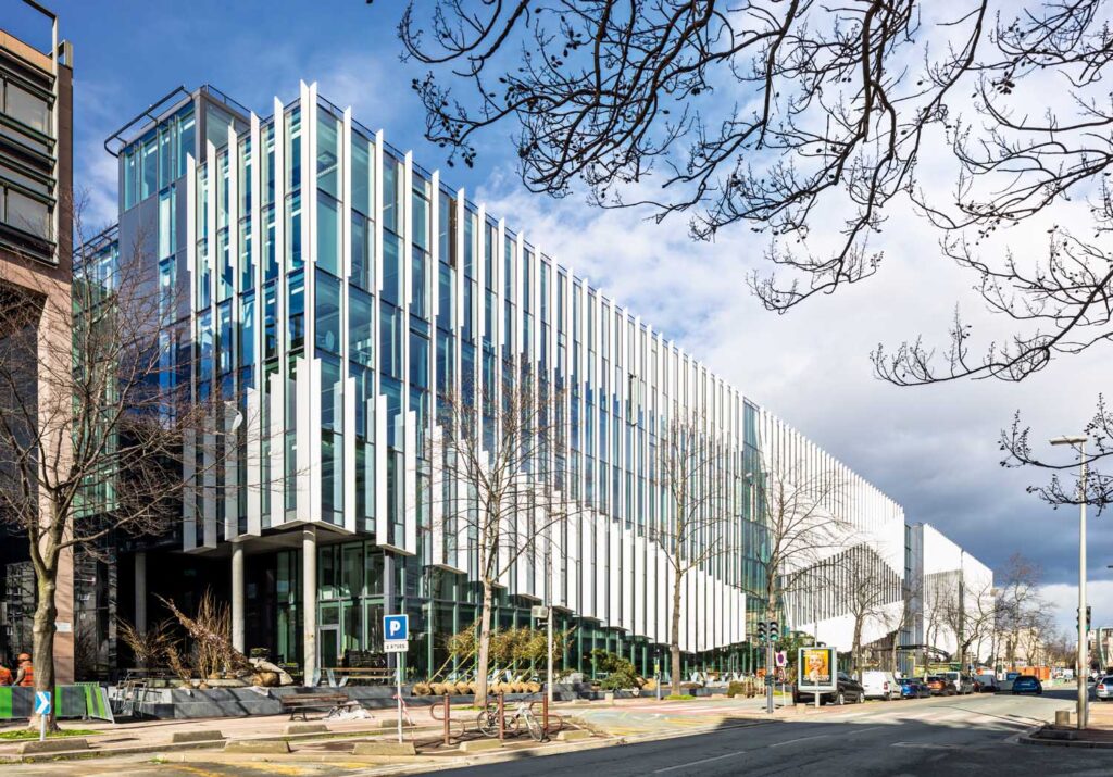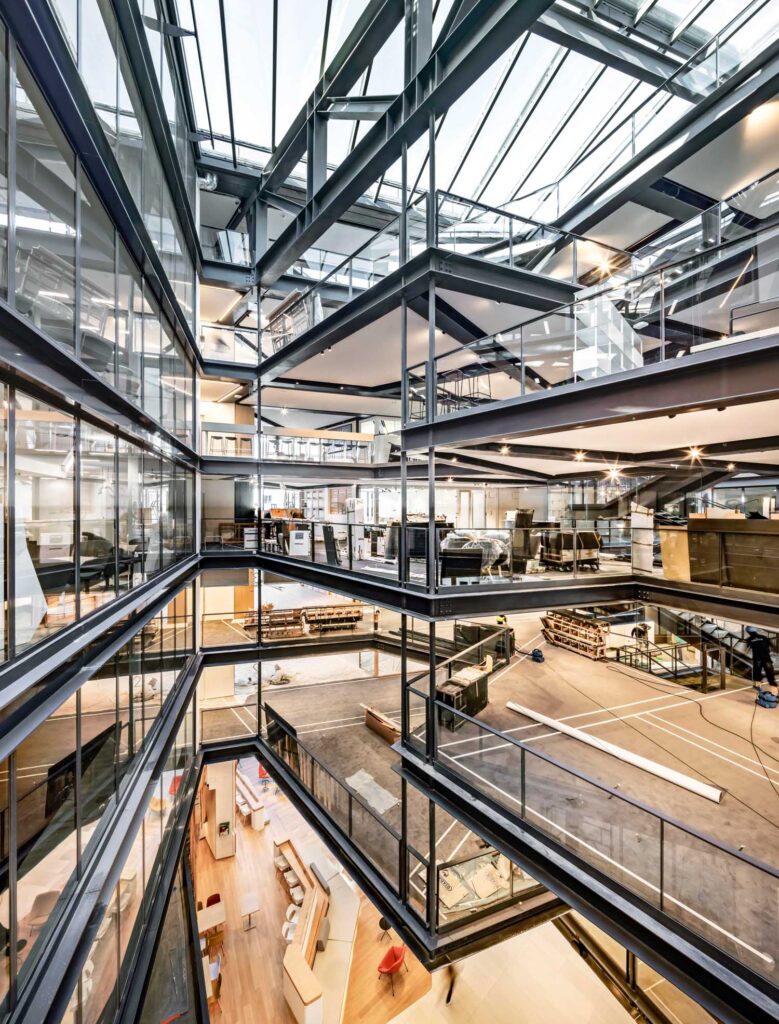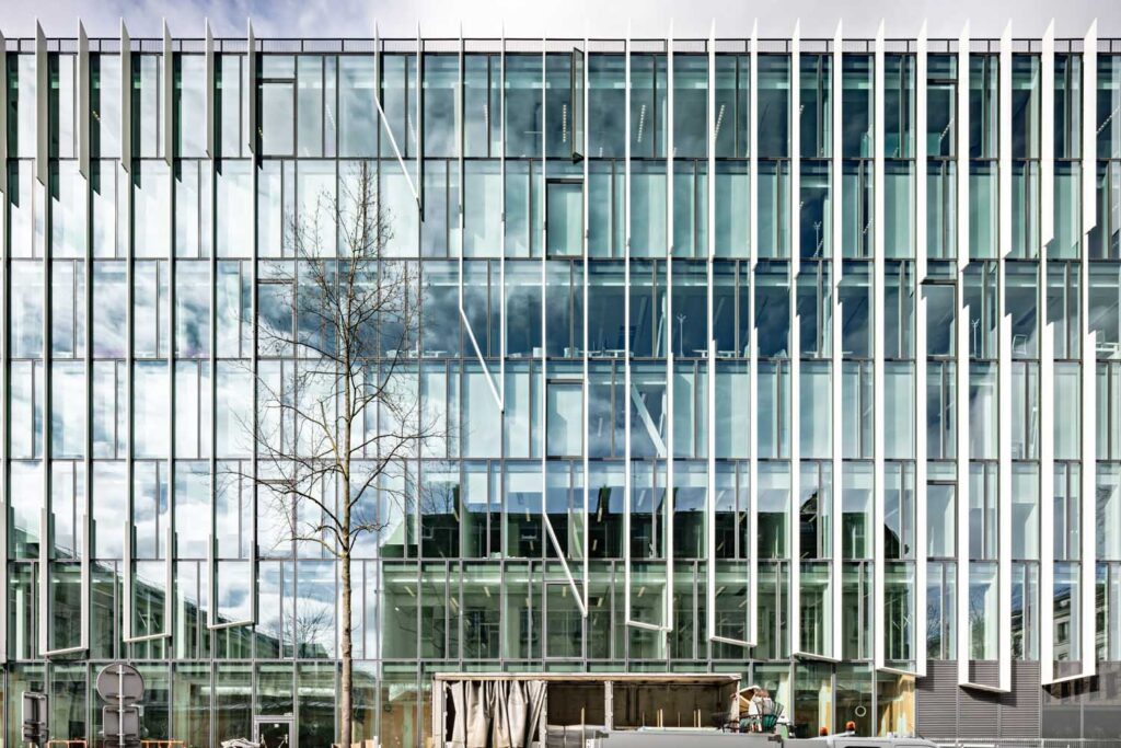 Dal punto di vista volumetrico, si realizza un passaggio interno che taglia l’edificio da est a ovest, attraverso il basamento completamente vetrato, dove trovano posto i servizi pubblici e di ristorazione – collegando i due parchi posti alle estremità e rafforzando il legame tra città e periferia. Gli angoli di questo volume sono svuotati grazie alle pareti vetrate arretrate, per conferire leggerezza a tutto l’insieme, altrimenti molto massiccio. Il blocco centrale viene demolito e sostituito da un vasto atrio, dove si installa un complesso sistema di solai, travi e scale in carpenteria metallica, completati da pannelli in calcestruzzo gettati in opera. Il complesso viene poi alleggerito da numerosi patii, che garantiscono una doppia esposizione e una grande quantità di luce naturale agli uffici posti sugli otto piani superiori.