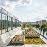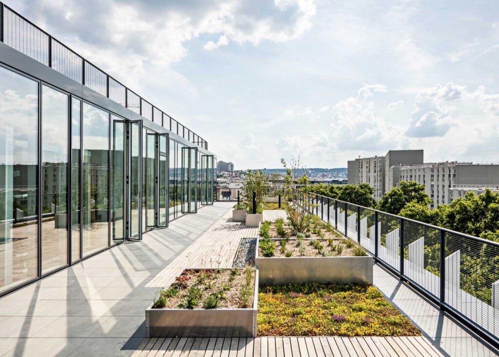 Dal punto di vista tecnologico, invece, è stata rimossa la facciata in calcestruzzo, sostituendola con un guscio ampiamente vetrato, completato da una trama frangisole. La demolizione è stata operata dall’alto verso il basso, grazie a uno strumento sofisticato (Omni Projets) atto a minimizzare i rischi di fragilità dell’esistente. Il sistema di lame verticali, frutto di ricerche, esperimenti e prototipi, ha portato alla scelta di elementi pultrusi, realizzati in resina e fibre di vetro da un’azienda italiana, che rispondono in maniera dinamica al problema tecnico della luminosità, offrendo un filtro e permettendo di scolpire il disegno di facciata. Così trasformato, l’edificio ha ottenuto la doppia certificazione BREEAM (Excellent) e HQE (Exceptionnel), prediligendo come fonti di energia quelle rinnovabili, e configurandosi come luogo di sperimentazione di molteplici pratiche ecologiche, come quella dell’agricoltura urbana sviluppata sulla copertura. Infatti, l’integrazione della vegetazione gioca un ruolo fondamentale, essendo presente su ciascun livello grazie a più di 1800 m2 di terrazze private, logge e balconi, estendendo così gli spazi lavorativi. La vecchia copertura, che un tempo ospitava parte del sistema di climatizzazione, è stata trasformata e vegetalizzata in tutti i suoi 2600 m2, si configura come uno spazio aperto dove poter lavorare, ospitando luoghi di condivisione e un ristorante. Al suo interno, 100 m2 sono dedicati all’agricoltura urbana che, oltre ad alimentare le cucine, è teatro di numerosi incontri pedagogici e laboratori atti alla sensibilizzazione sul tema dell’ecologia.