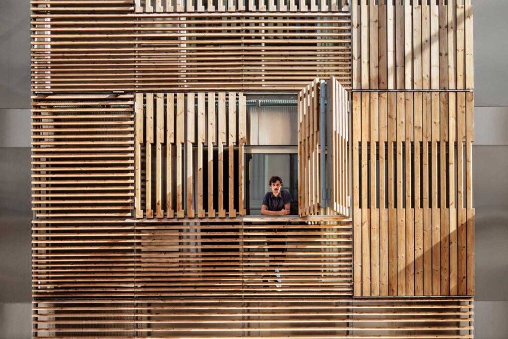 Il sistema scelto è quindi quello delle schermature solari, che non solo aumentano la privacy degli utenti, ma permettono anche di migliorare le prestazioni energetiche dell’intero complesso. L’intervento è stato pensato a strati: uno interno, di acciaio e vetro, e uno esterno, composto da una serie di listelli in legno che, così composti, formano un brise soleil.