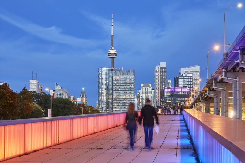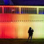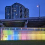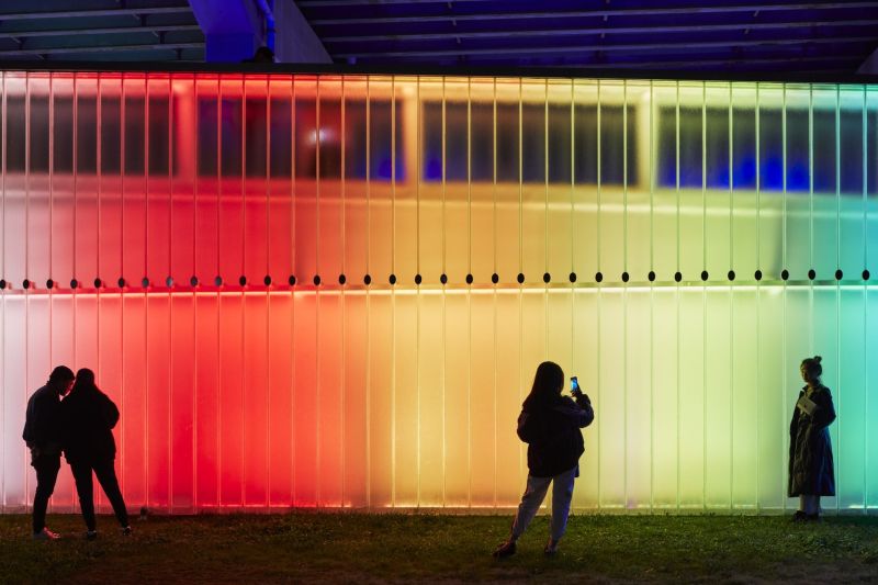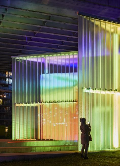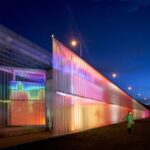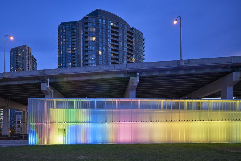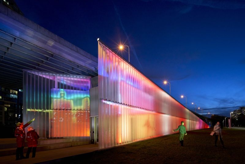 L’installazione Thermally Speaking, a opera del collettivo LeuWebb Projects e Mulvey&Banani Lighting, parte dal presupposto che i nostri corpi siano dei contenitori di energia, costituiti da fuoco e da acqua in quanto sottoposti a continuo rinnovamento e morte a livello cellulare. Perciò, traducendo questa energia radiante in una mutevole cortina luminosa, è stato possibile animare le facciate vetrate dell’edificio del Fort York Visitor Centre, a Toronto.