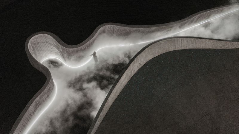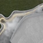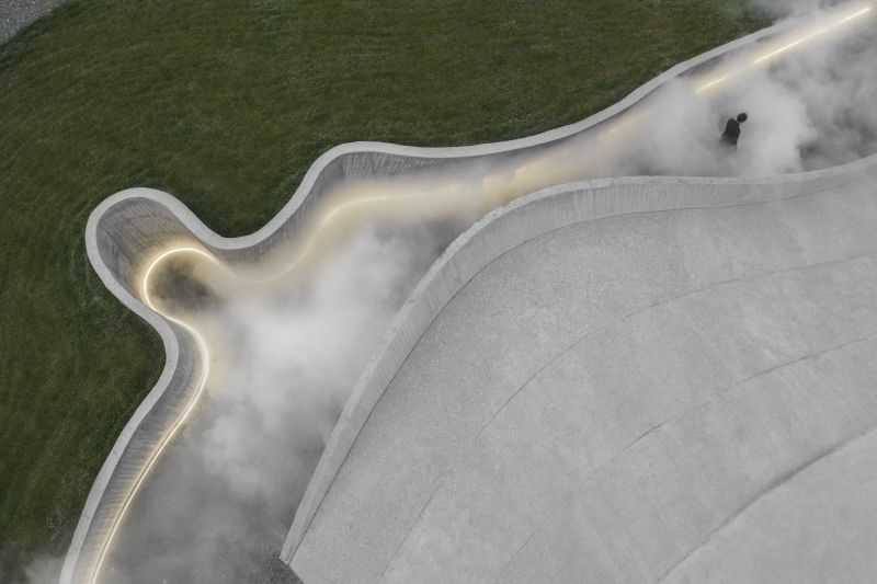 Di notte, la sensazione di un cielo stellato viene riprodotta su uno dei due lati esterni del muro, grazie a piccoli frammenti di pietra azzurra distribuiti in maniera irregolare. All’interno, invece, una sinuosa striscia LED accompagna il visitatore per tutta la durata del percorso, riempiendo lo spazio nebbioso di luce fredda.