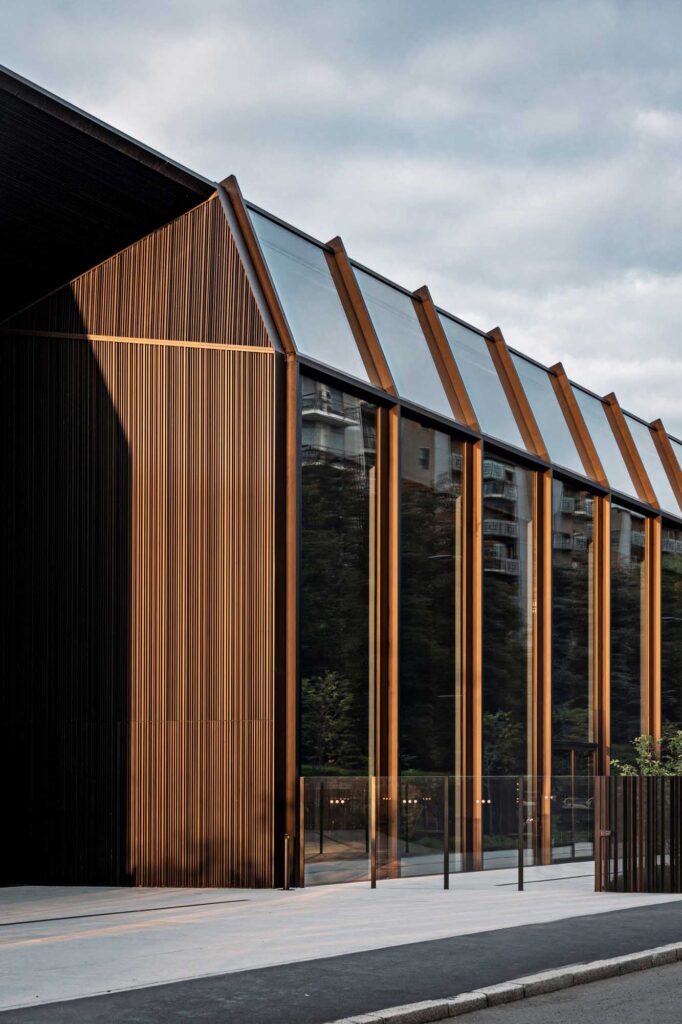 Il tocco innovativo e sostenibile, in questo caso, è dato dal vetro stesso della facciata, scelto strategicamente per conferire massima trasparenza all’interno della struttura e, per regolare al contempo il flusso termico tra interno ed esterno. In questo caso la non è neppure necessario schermare la facciata: dato che è rivolta a nord questo la piena libertà dei progettisti di lasciare libero questo elemento, come simbolo dell’edificio. Al contrario, le facciate opposte sono rese cieche, per rispondere alle problematiche legate all’irraggiamento e per mettere ancor più in risalto la monumentalità del complesso e delle ampie vetrate.