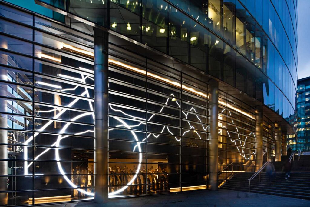 Spostandoci oltremanica incontriamo un progetto che, come il precedente, fa della sua facciata il simbolo iconico dell’edificio, ma rendendola in questo caso un elemento interattivo e di comunicazione con il pubblico. Stiamo parlando dell’edificio sito a 10 Exchange Square di Londra, all’interno del complesso di negozi e uffici progettato da SOM nel 2004. Lo studio di progettazione Coffey Architechts ha optato per un intervento di retrofit leggero, che ha trasformato la precedente struttura obsoleta in un ambiente caldo e di benessere per i suoi utenti.