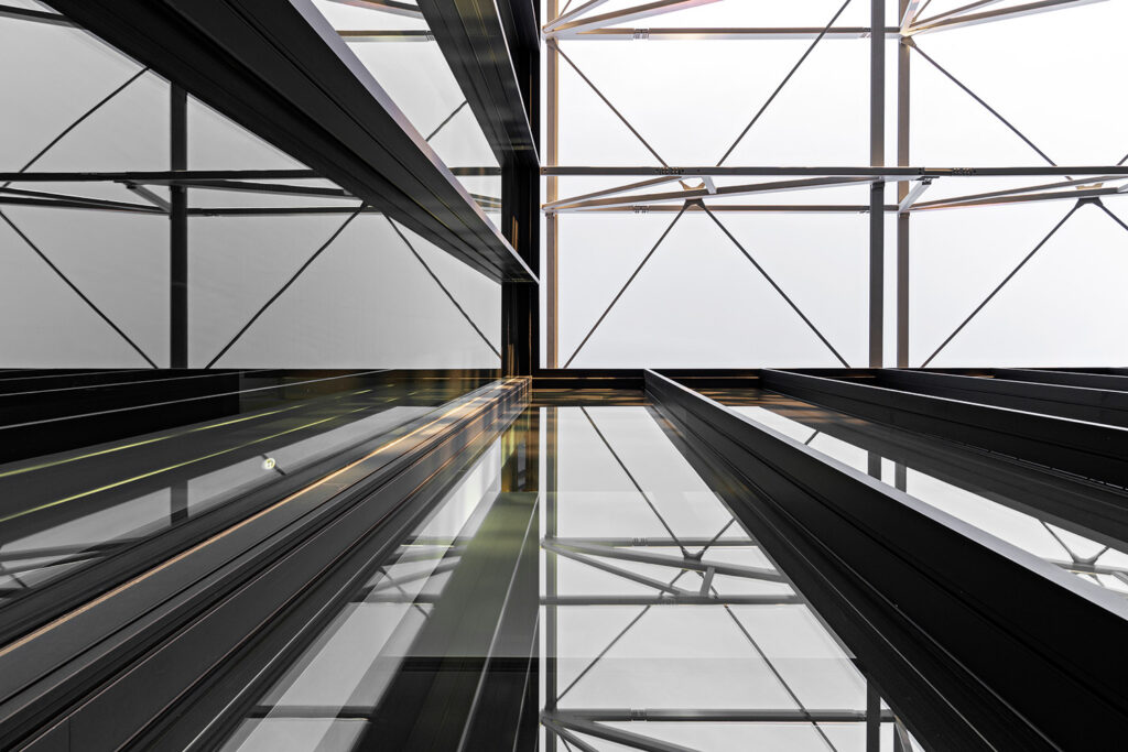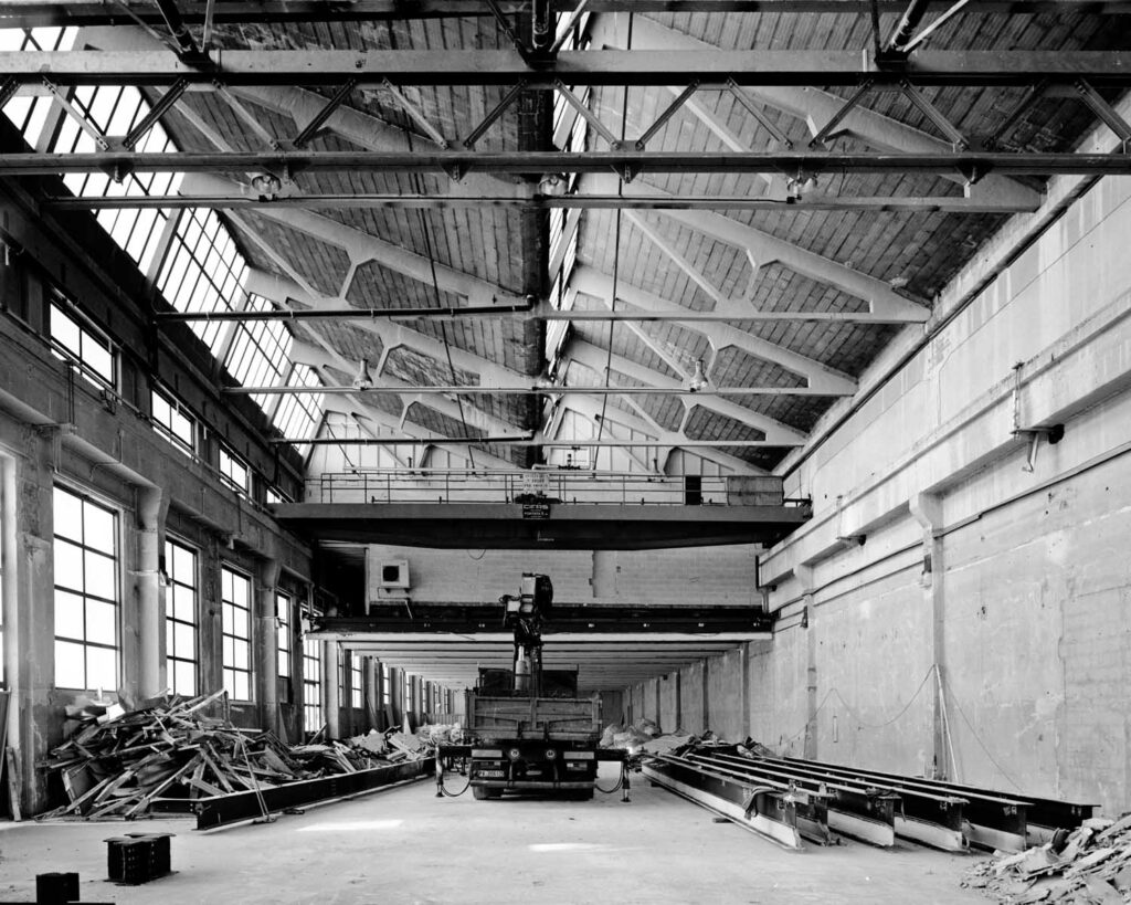 Per rendere ancor più impattante l’elemento architettonico in facciata, l’interno della struttura è stato completamente svuotato e liberato dalle partizioni: si crea così un ambiente fluido e libero, enfatizzato dalla luce che proviene dalle facciate e dagli shed, che con semplici accorgimenti è riuscito a trasformare una struttura inutilizzata e di alto impatto ambientale in un edificio simbolico per la città e per la futura produzione architettonica italiana.