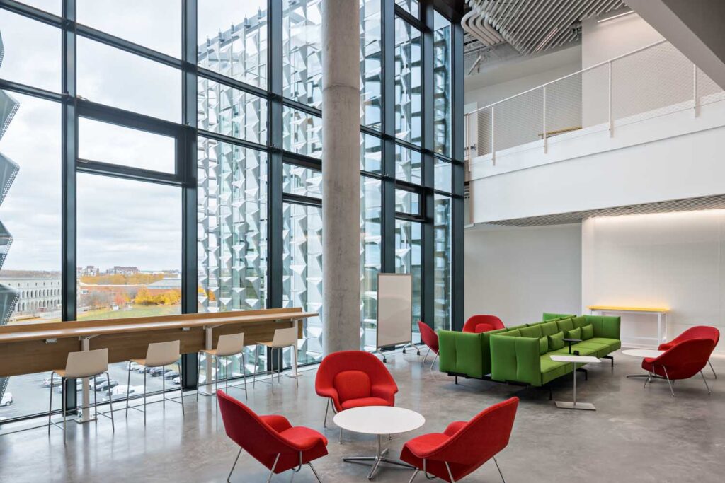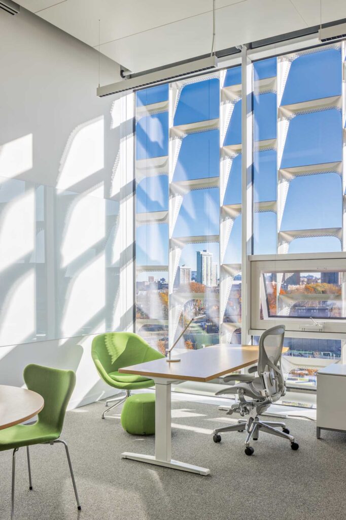 Ventilazione, illuminazione naturale e ombreggiamento forniti dalla facciata sono integrati all’interno da sistemi idronici di riscaldamento e raffreddamento distribuiti attraverso pannelli radianti a soffitto.