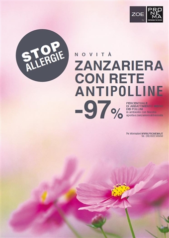 Sapevate che per milioni di italiani l’arrivo della primavera è causa di forte disagio? Lo dicono le cifre: è un quadro piuttosto significativo quello diffuso dall’Istituto Superiore di Sanità, secondo cui un italiano su quattro soffre di una qualche allergia. E, tra le allergie, quella causata dai pollini è senz’altro la più diffusa. La strategia migliore per combattere il problema è evitare il contatto. Sì, ma come? Oggi Pronema propone, con Zoe, una soluzione risolutiva, una barriera protettiva, garantita e certificata, che non solo difende dagli insetti ma anche dai pollini. Cliccare qui per saperne di più