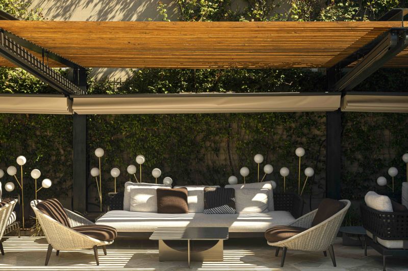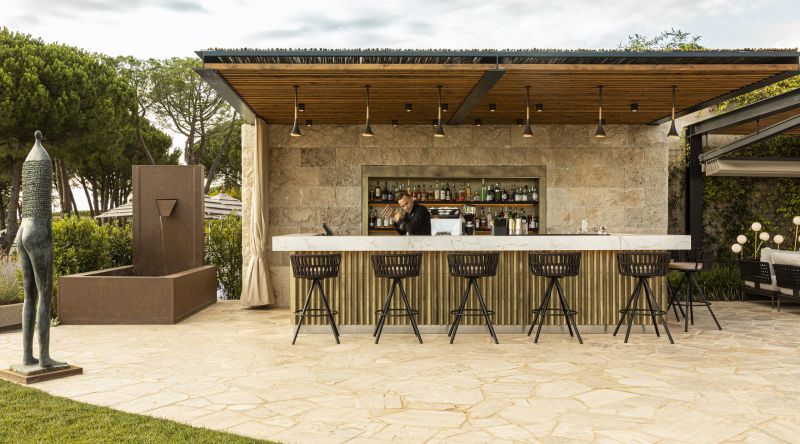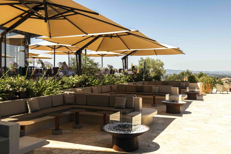 L’obiettivo del progetto era proprio quello di guidare l’occhio dell’ospite verso il panorama anche con la creazione di nuove sedute tutte rivolte in quella direzione. Il percorso procede poi verso un’area verde in cui, sotto ulivi secolari, sono state posizionate delle sedute lounge per creare un’area relax in esterno. Per arrivare a questa zona relax sono state scelte alcune panche in cemento con un fire place che consente di ricreare momenti di intimità. Tutta la pavimentazione degli esterni è stata rinnovata con il travertino, un leitmotiv di tutto il progetto di interiors dell’hotel. Dalla parte opposta del corpo ristorante sono state previste delle zone lounge bar o relax per rilassarsi protette da strutture a L dotate di coperture brise soleil, un sistema di ombreggiatura che non crea un impedimento visuale sul fronte.