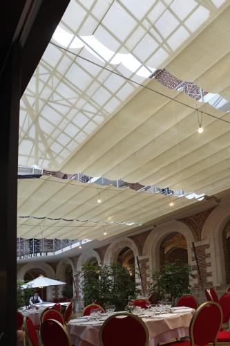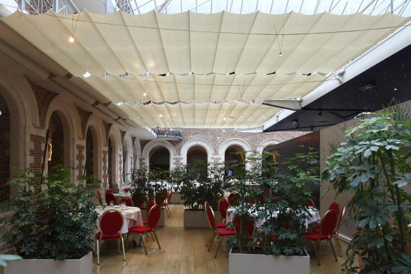 Dichiarato monumento storico, l’Hotel Alliance de Lille, chiamato anche “Couvent des Minimes”, è un antico luogo di preghiera e di predicazione, un vero chiostro che sembra ancora vivere al ritmo della regola monastica. Nel cuore di questo luogo fuori dal tempo, espressione dell’architettura fiamminga del 17° secolo, il ristorante dell’hotel, “Le jardin du cloître”, accoglie i propri ospiti sotto un tetto in vetro di 900 m². Una struttura che richiede comfort visivo e protezione solare ottimale ma anche equilibrio estetico e prestazioni tecniche. I tessuti Sunworker® Dickson, appositamente creati per strutture architettoniche con ampie superfici vetrate, hanno offerto la soluzione a questa necessità. Installata come un velo ombreggiante interno, la tela creata da Dickson mette fine all’effetto serra e al disagio visivo provocato dall’irraggiamento solare, arricchendo l’ambiente di un tocco di originalità e modernità.