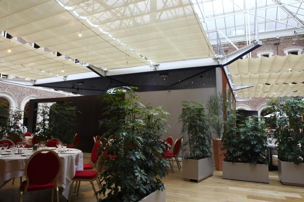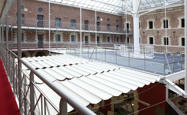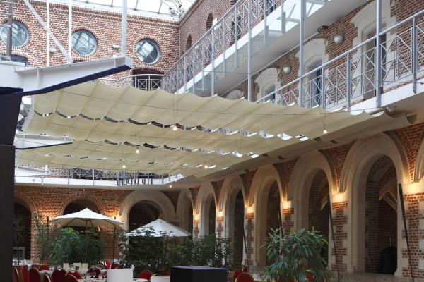 I156 m²di tela dei veli ombreggianti meccanici prodotti dall’impresa Stad Gourlet (Dunkerque) hanno permesso la creazione di 8 tende di7,50 mx 2,6 m. Installati dall’impresa ASF (Marcq-en-Baroeul), i veli ombreggianti interni conciliano equilibrio estetico e performance visive: oggi infatti “Le Jardin du cloître” sfrutta al meglio della luce del giorno, senza effetto serra, riducendo al minimo l’illuminazione artificiale.
