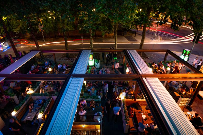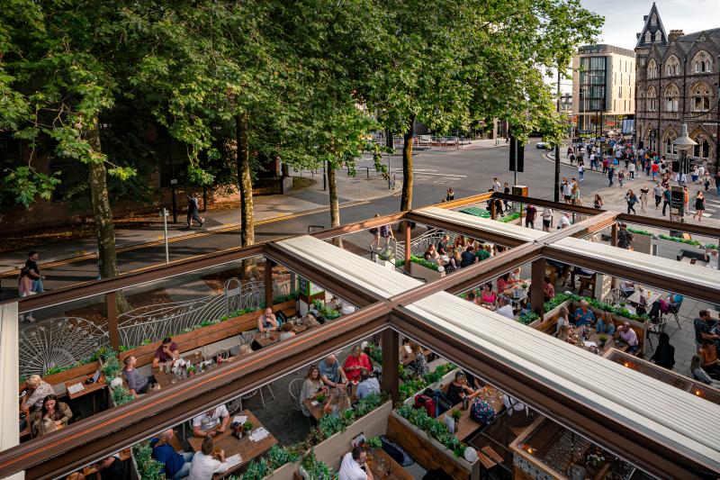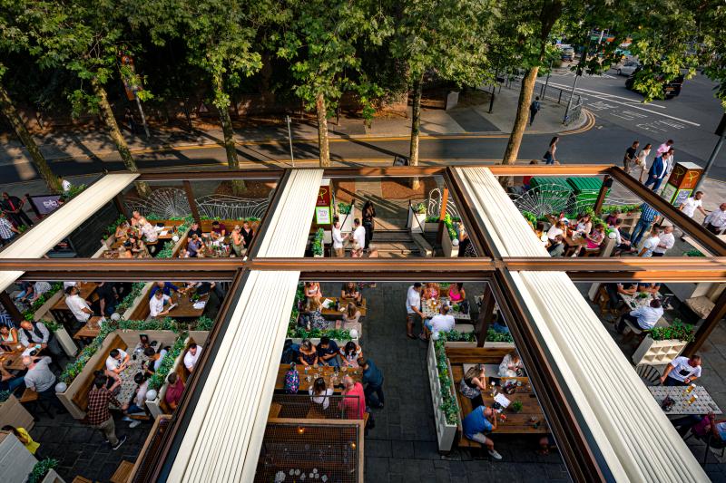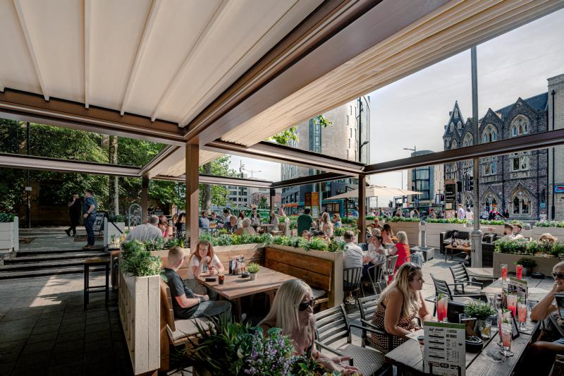 Il nuovo volto del Peppermint di Cardiff con le pergole Med Zenit di Gibus