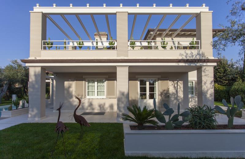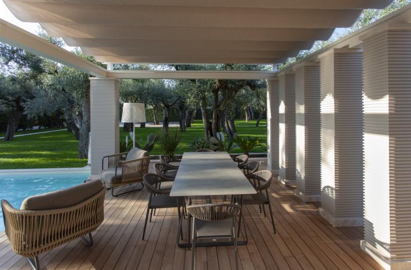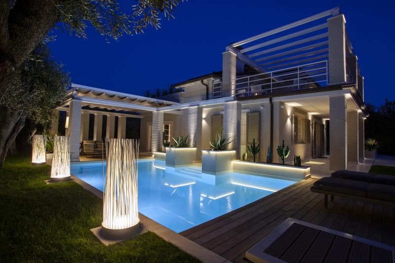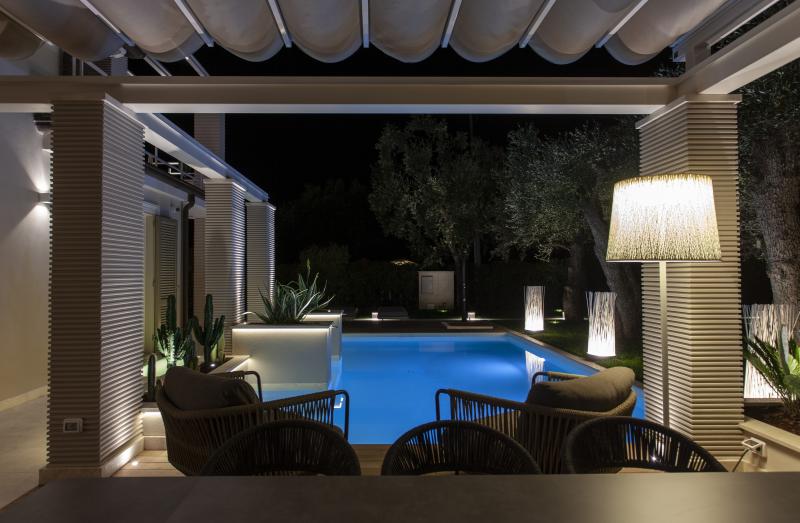 Le fioriere come arricchimento e piacere per gli occhi sono state aggiunte anche in alto, sopra alla pompeiana, per creare simmetria e linearità onde nascondere la falda del tetto e far sì che risulti come un piano superiore. Nelle zone adiacenti all’acqua e dove sono stati posti dei lettini prendisole è stato inserito del legno teak per produrre un contrasto di colori. Il tocco di classe e d’intesa tra natura e costruito è dato dalle lampade che, grazie alla loro forma e particolarità, prendono vita con il vento, proprio come gli ulivi che la circondano e di notte donano classe e armonia.