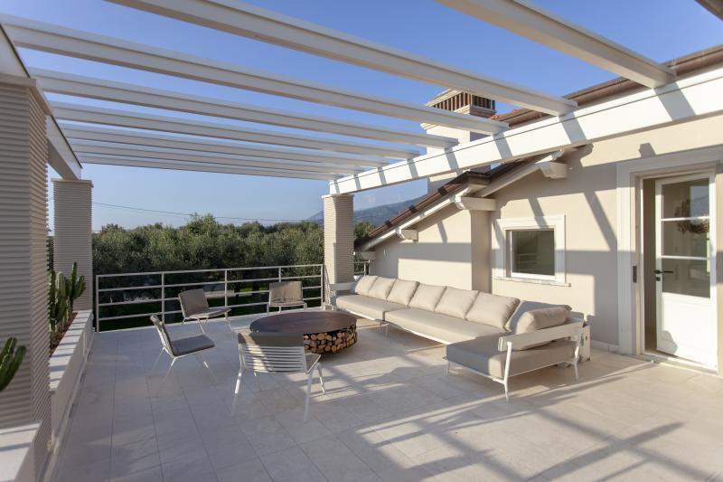 La terrazza al piano superiore è un luogo di incontro e di armonia, con divani e poltrone per rilassarsi in un ambiente caldo e accogliente senza rinunciare al piacere degli spazi aperti. Al centro, a creare convivialità, un braciere in corten, un oggetto dal carattere forte ma allo stesso tempo lussuoso e gradevole. Anche in questa parte, immancabili, le fioriere valorizzate da faretti. Per poter godere al meglio della comodità dell’ampia terrazza è stata pensata una cucina, anch’essa con inserti in corten. Tutte le rifiniture sono in travertino per riprendere i colori chiari dell’intero progetto.