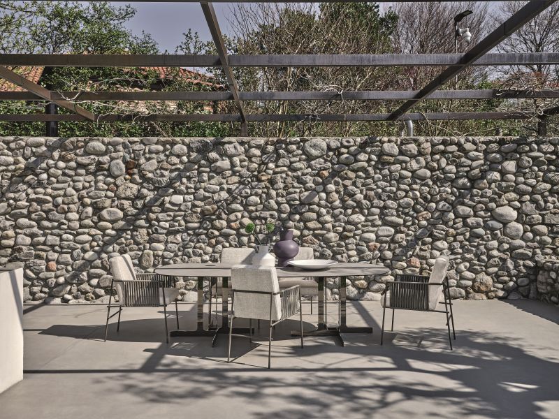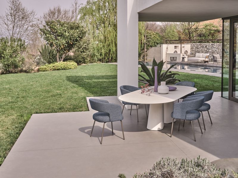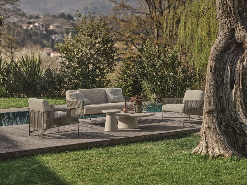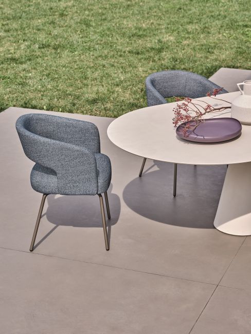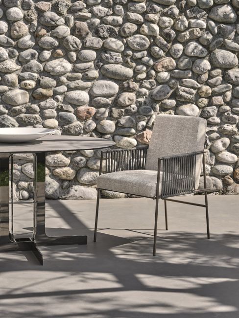 Un’altra collezione di Stefano Spessotto si apre all’outdoor: la poltrona Kyo mantiene la struttura e il comfort della sua versione indoor mentre i braccioli e la schiena sono stati arricchiti da un intreccio di corda che la rendono inequivocabilmente perfetta per l’ambiente esterno. Anche le sedie Kyo sono state impreziosite da un intreccio sui braccioli. La nuova ed esclusiva selezione di tessuti rende questa sedia perfetta anche per la nuova collezione outdoor.