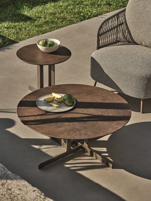 I tavolini Nell di Gabriele e Oscar Buratti sono realizzati quest’anno anche per l’outdoor con finiture da esterni in cui un top a contrasto in marmo, gres o HPL poggia su di una struttura estremamente leggera. Le sottilissime lame metalliche della base permettono di usarla sia singolarmente che in coppia, per tavoli rotondi, ovali o rettangolari.
