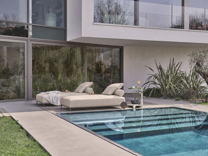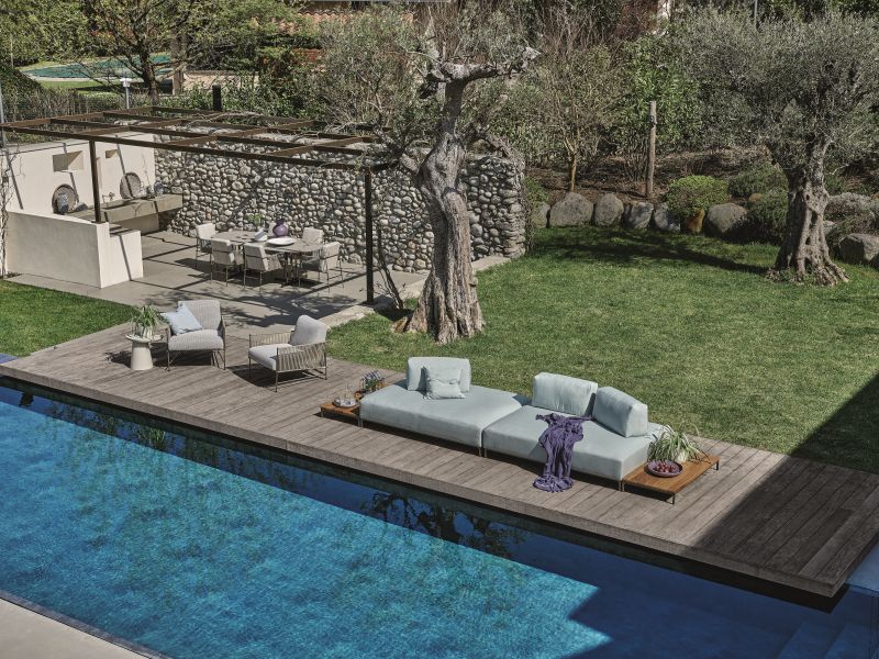 Una gamma di nuovi tessuti outdoor arricchisce questo divano di una veste nuova, dai colori tenui ed eleganti, perfetti per l’ambiente esterno. I tavolini, disponibili in due diverse dimensioni, fatti a pedana in legno massello completano il divano.