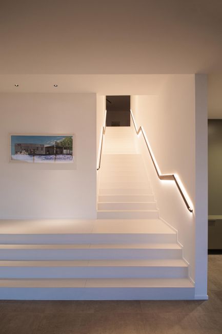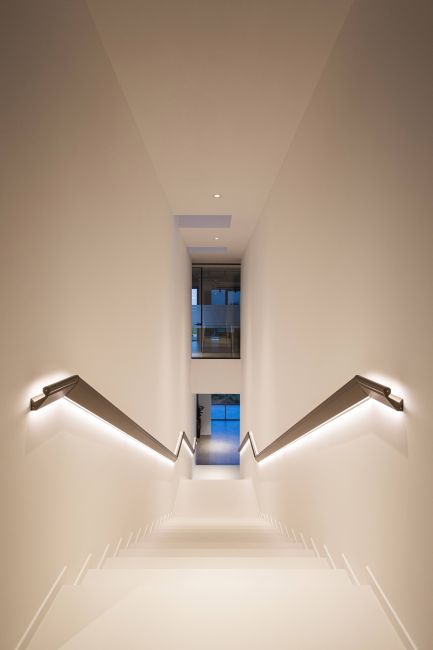 La sorgente luminosa posta nella parte inferiore illumina i gradini, rendendoli sicuri da percorrere. La sorgente luminosa posta nella parte interna proietta la luce verso la parete, in modo da illuminare tutto il vano scale evitando l’abbagliamento.