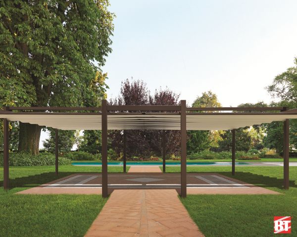 Arreda con armonia ed elegante modernità lo spazio all’aria aperta, capace di rendere unico ogni tipo di ambiente esterno. PERGOSQUARE di Brianzatende soddisfa l’esigenza di un’installazione di grande impatto visivo ed emotivo: un valore che dura nel tempo e rende esclusivo qualsiasi ambiente. Struttura autoportante dal funzionamento manuale ad argano o motore. Profili portanti in alluminio estruso di sezione 130x80mm assiemati da eleganti staffe in acciaio verniciato. Sistema di trazione con cinghia dentata di alta resistenza, funzionante su cuscinetti a sfera e carrelli. La copertura mobile, a telo in strisce di tessuto PVC ignifugo di ottima stabilità dimensionale, è indicata per la protezione dal sole e dalla pioggia. Teli separati con doppia pendenza laterale per lo scarico dell’acqua. Possibilità di scaricare l’acqua da un solo lato della struttura o in modo alternato, e di integrare nei profili ovalina, il contro telo inferiore ad onde in tessuto acrilico, per un ottimale confort estetico.