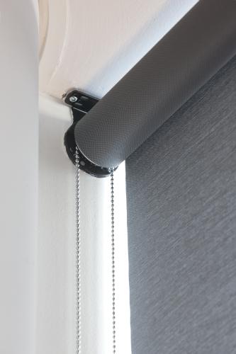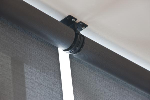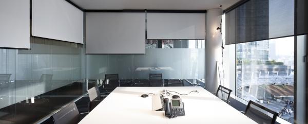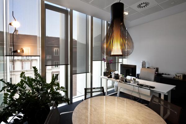 Nella piccola sala riunioni sono presenti due modelli F 105 a catena con tessuto Black Glass nero, Negli uffici invece il tessuto scelto dal committente è ancora una volta l’E-Screen in tonalità nero/perla che permette una visibilità esterna schermando la luce. La scelta di avere manovre a catena per tutti i sistema permette una totale flessibilità nello schermare gli ambienti.
