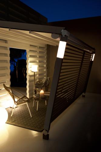 Pergotenda® Iridium 5.2, alluminio che diventa leggerezza. Ancorata ad una parete di supporto e composta da una struttura in alluminio ed un telo con chiusura ad impacchettamento, Pergotenda® Iridium 5.2 si può aprire e chiudere anche sui lati perimetrali. Forme sobrie e forza strutturale in perfetto stile Corradi.