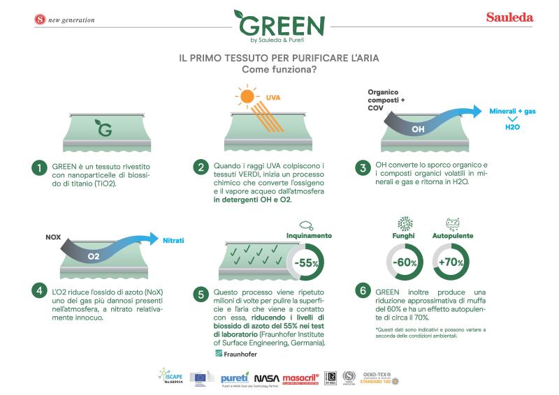 Nel mercato della protezione solare, una valida risposta all’esigenza di ridurre le sostanze inquinanti arriva da una stretta collaborazione tra Sauleda, noto produttore di tessuti acrilici tinti in massa e Pureti, leader mondiale nella tecnologia dei fotocatalizzatori. Insieme a queste due importanti realtà Giovanardi propone Irisun Green: un prodotto innovativo quale alternativa sostenibile nel mondo delle tende da sole.