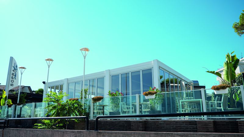 La superficie del locale è totalmente sviluppata sotto le pergole Sunroom, garantendo di poter godere dell’aria di mare in tutte le stagioni e in ogni condizione climatica. Per sfruttare al meglio questa posizione sono state installate tre pergole bioclimatiche Oskura Waterproof Sunroom.