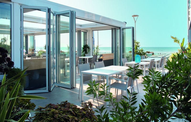 Per rendere ancora più esclusiva la realizzazione, la committenza ha deciso di installare la vetrata pieghevole Sunroom S.60 TT con profili a taglio termico. Sui due lati di profondità le vetrate presentano una tipologia a nove ante con impacchettamento su un solo lato, mentre sul fronte troviamo quattro ante per ciascuna delle tre pergole. Il taglio termico consente un’ottimale isolamento termo-acustico, motivo per cui è possibile sfruttare la location non solo durante la stagione estiva, ma tutto l’anno.