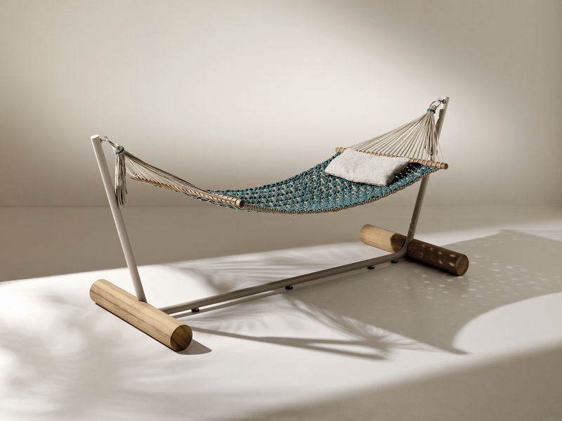 L’amaca della collezione Patio è caratterizzata da un sofisticato intreccio che nel motivo sembra tessere delle onde, richiamando la tipica oscillazione di questo elemento, emblema del relax. Patio, creata da Ethimo con Studio Zanellato/Bortotto, è una collezione composta da elementi lounge (poltrona, divano tre posti, daybed e coffee table) e dining (tavolo rotondo, tavolo ovale e poltroncine abbinate) dove l’uso creativo dell’intreccio è abbinato alla bellezza naturale del teak.