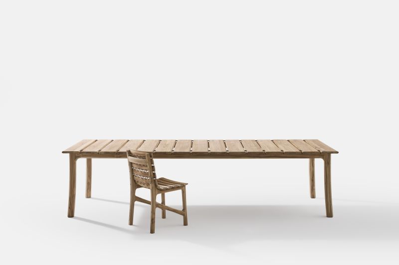 Teseo, la nuova collezione dining disegnata da AMDL Circle per Roda, composta da tavolo e sedia da pranzo si distingue per un dettaglio sartoriale unico, che unisce tra loro le doghe in teak tramite una cucitura continua di corde, in un abile incontro tra tradizione artigianale, efficienza industriale e innovazione tecnologica.