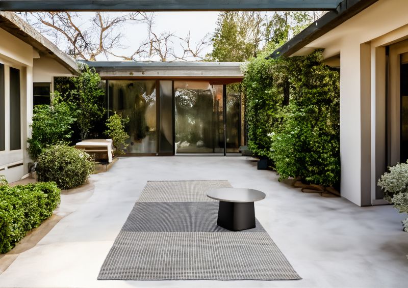 Quella di Meridiani (design Paolo Zani) è una geometria ortogonale, bicolore realizzata in filato di produzione Raytent™, acrilico riciclato. Un tappeto outdoor di Warli delicatamente grafico, delineato dal tocco morbido del filato con una leggera cangianza.